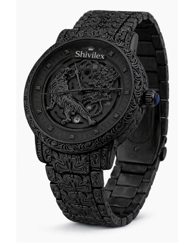 Premium Shivilex luxury watch featuring an all-black engraved tiger and dragon skeleton dial, stainless steel strap, quartz movement, and a bold royal look perfect for parties, weddings, and gifting.